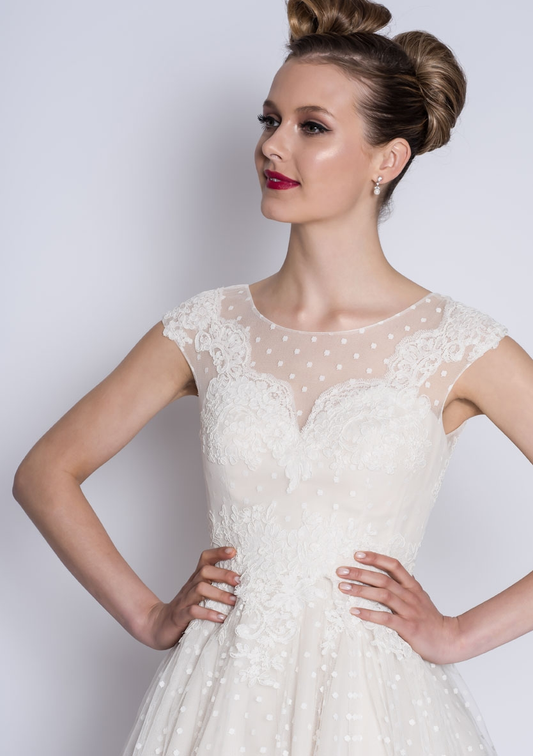86-Flossie - Tea length wedding dress with vintage inspired lace and tulle and satin bow belt