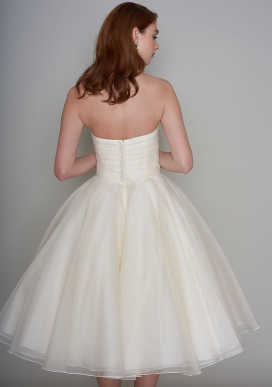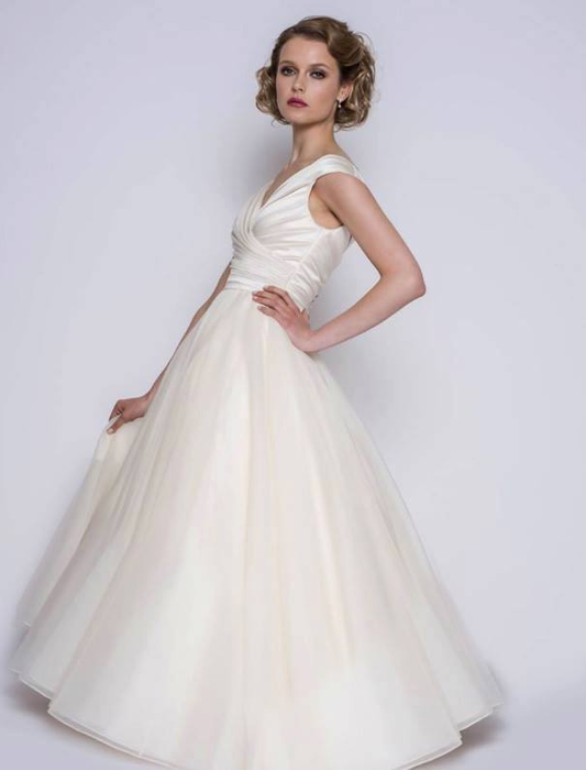 Pretty, feminine wedding dress with a full ivory organza tea length skirt rd-luna
