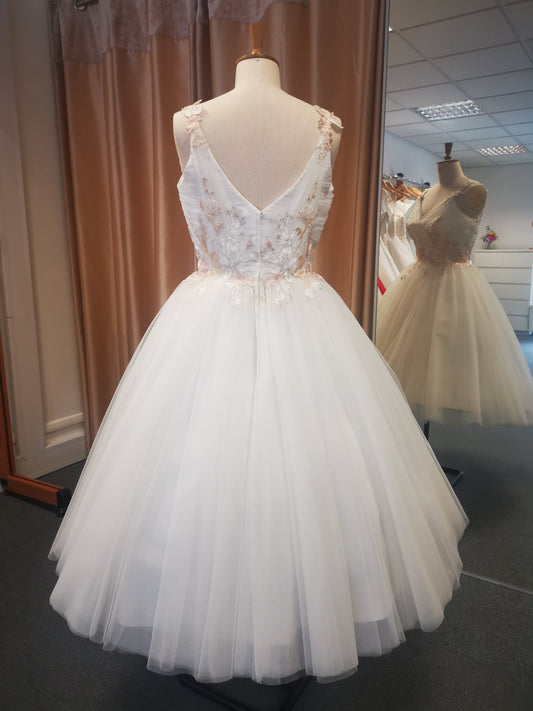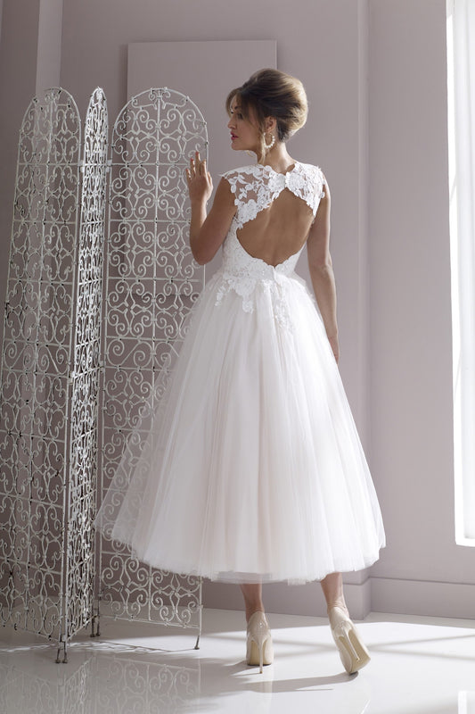 hn-sally Lace and tulle tea length wedding gown