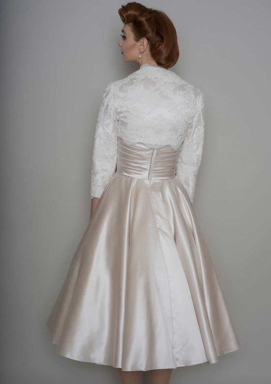 86-iris Tea Length vintage inspired lace bodice and full circular satin skirt wedding dress