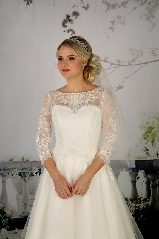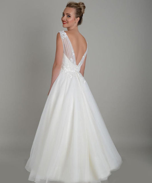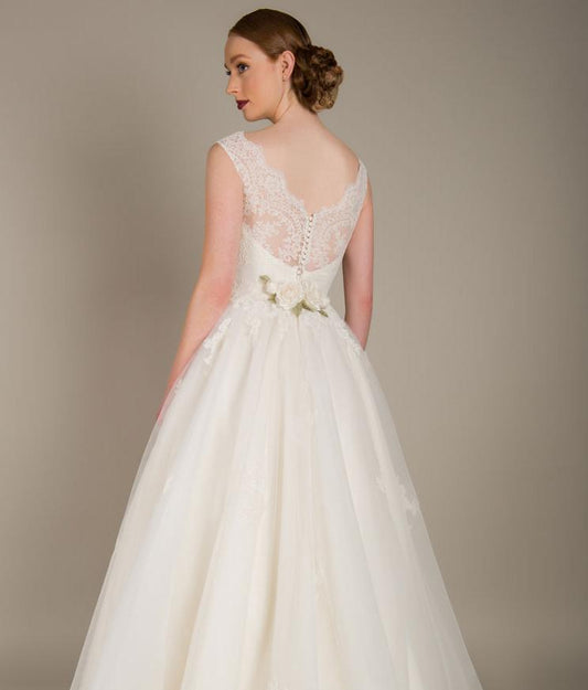 86-emmie Lace and tulle wedding gown with scoop back, illusion neckline and full skirt