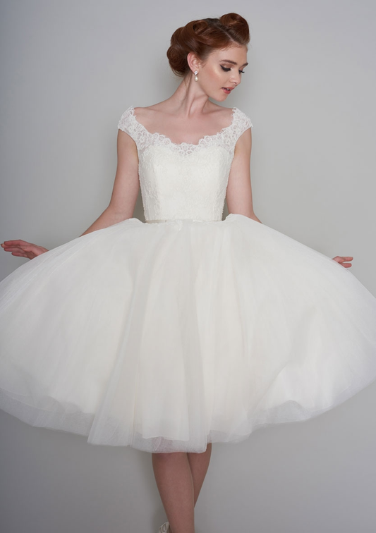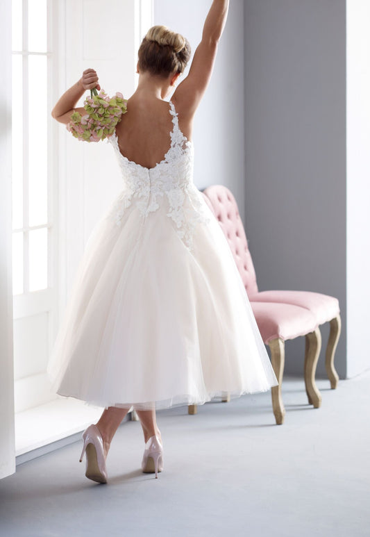 Discover the timeless charm of tea length wedding dresses, perfect for brides seeking elegance with a playful, retro twist. Whether you're dreaming of a classic 1950s-style wedding dress with a full skirt and petticoats, or a graceful ballerina length bridal gown that skims the ankles, our collection has the perfect fit for you.