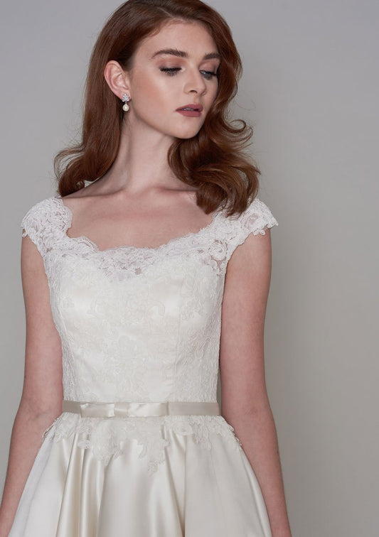 lw-saskia Tea length bridal gown with embellished bodice and cap sleeve