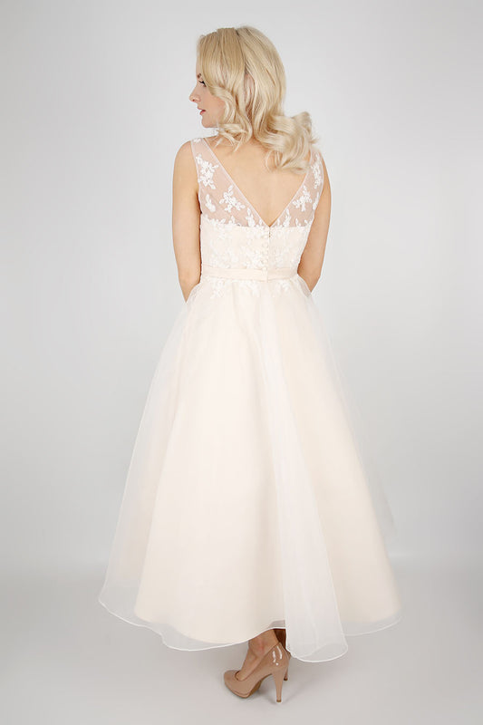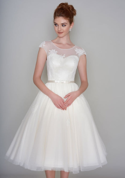 86-Flossie - Tea length wedding dress with vintage inspired lace and tulle and satin bow belt