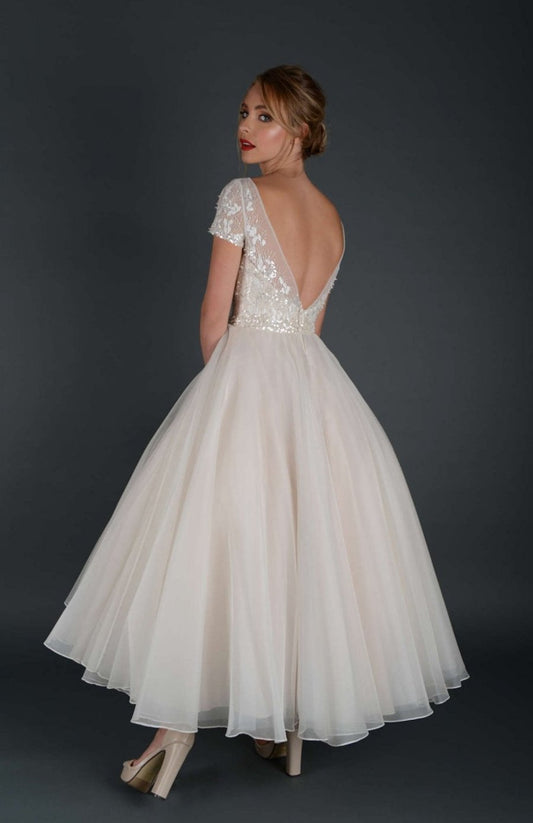 wr-rhiannon Sequin embroidered tulle Fifties style tea length wedding gown
