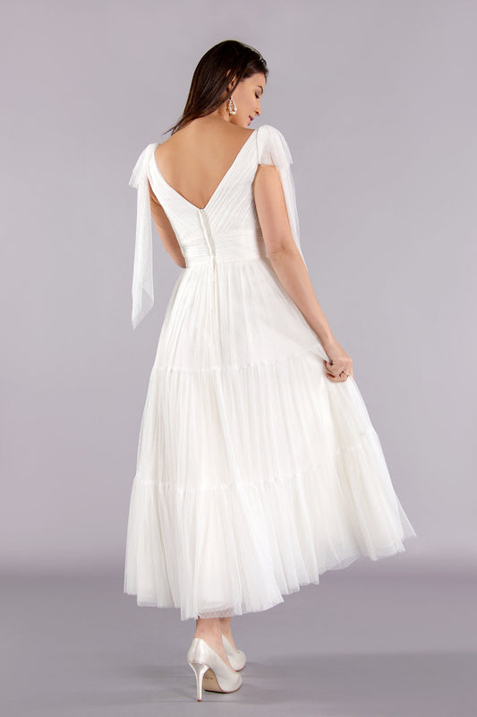 Pleated tulle tea length wedding dress with thin bodice straps | rd-iris