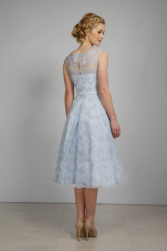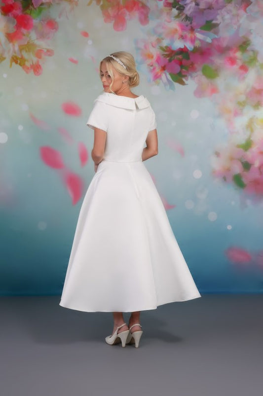 Beautiful tea-length satin bridal gown with a floral embroidered lace bodice rd-rosie
