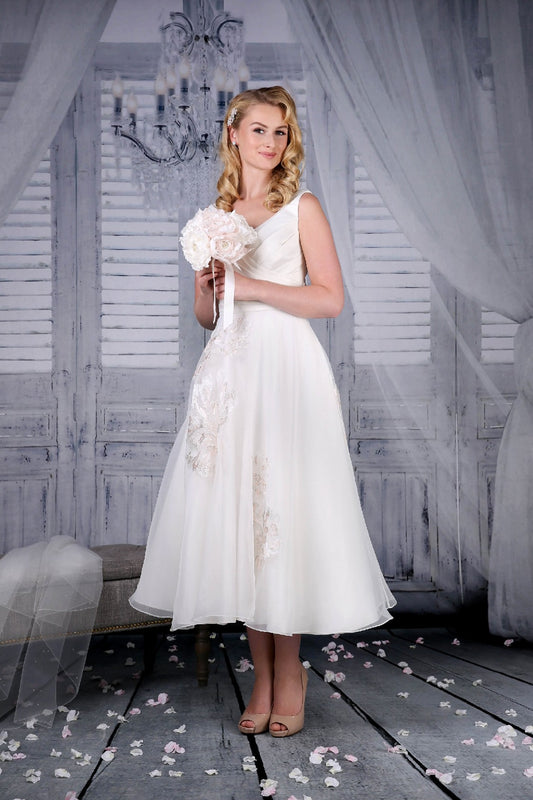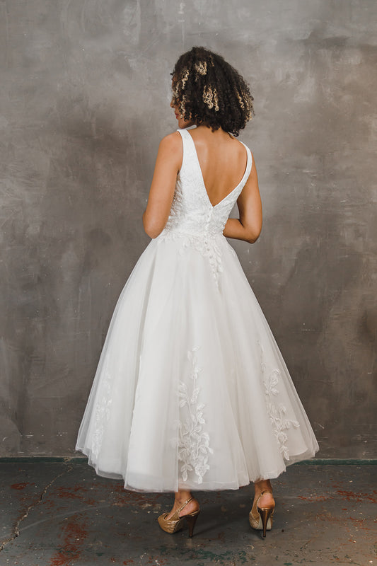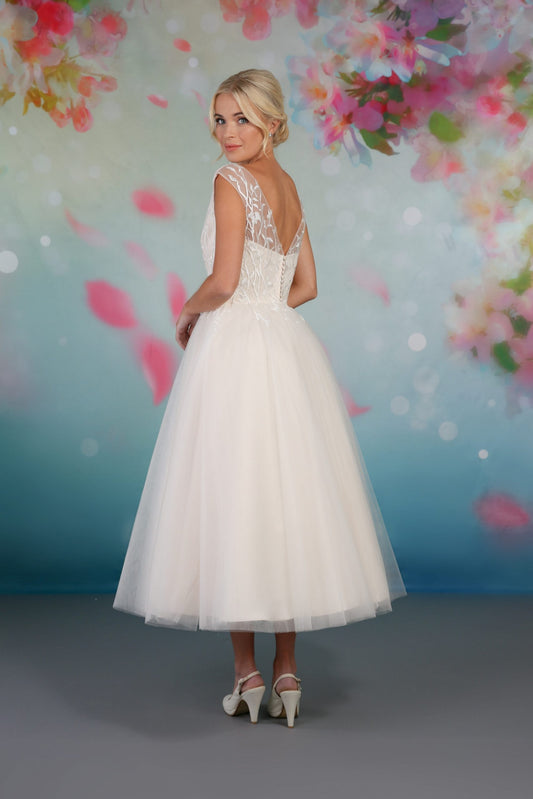 Discover the timeless charm of tea length wedding dresses, perfect for brides seeking elegance with a playful, retro twist. Whether you're dreaming of a classic 1950s-style wedding dress with a full skirt and petticoats, or a graceful ballerina length bridal gown that skims the ankles, our collection has the perfect fit for you.