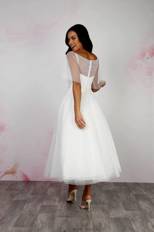 Exposed bone bodice, spotty tea length wedding gown - om-2021-1546prd