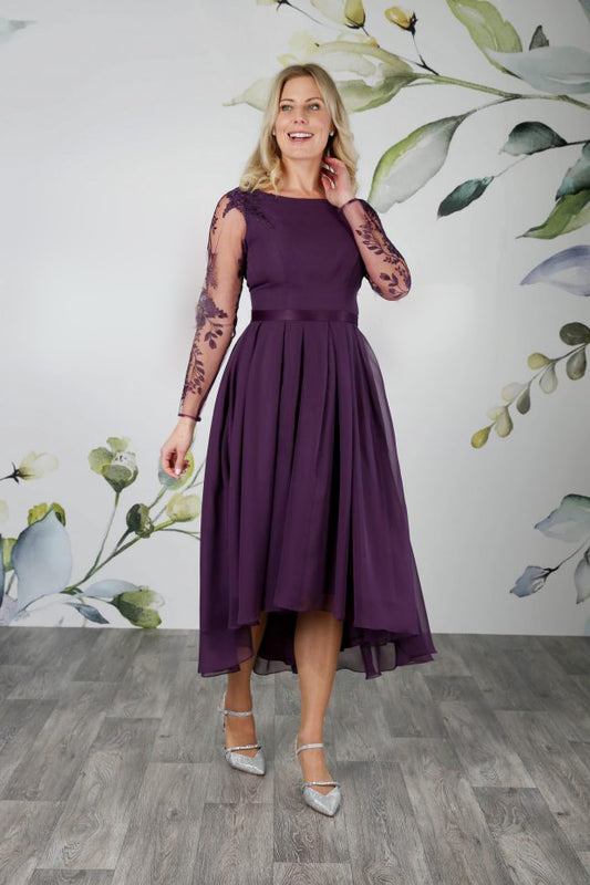 Tea length wedding dress with high low hem and a fully pleated chiffon skirt | rd-linton