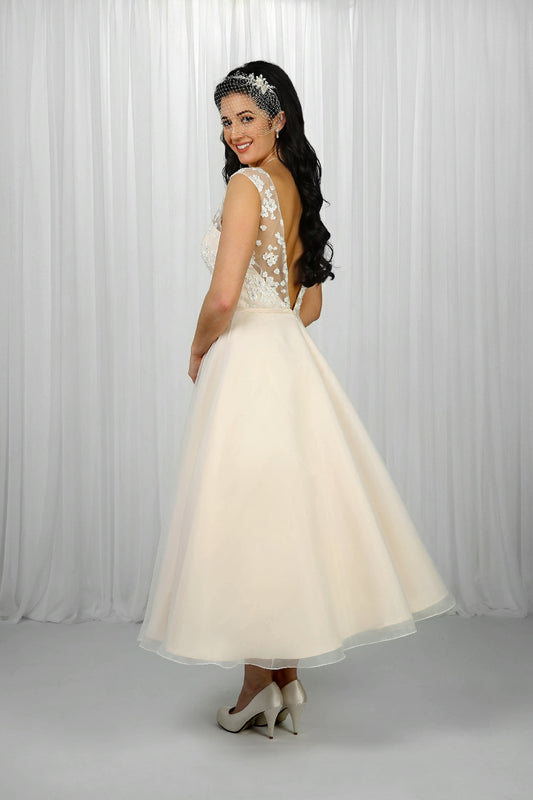 Stunning tea-length bridal gown with a full tulle skirt, and gorgeous lace bodice | em-mabel