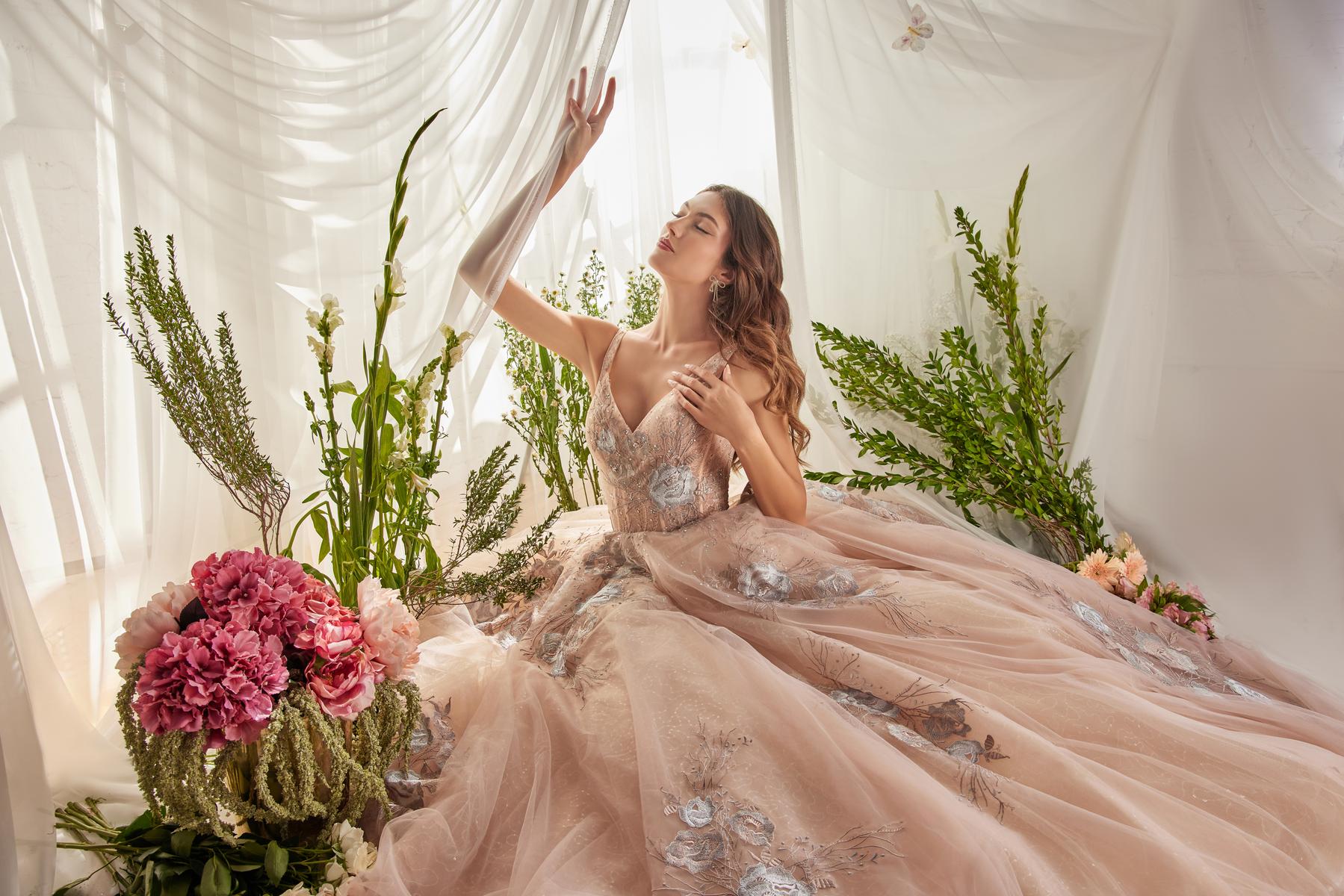Bodice: Floral embroidery with embedded crystals, built-in corset structure for support