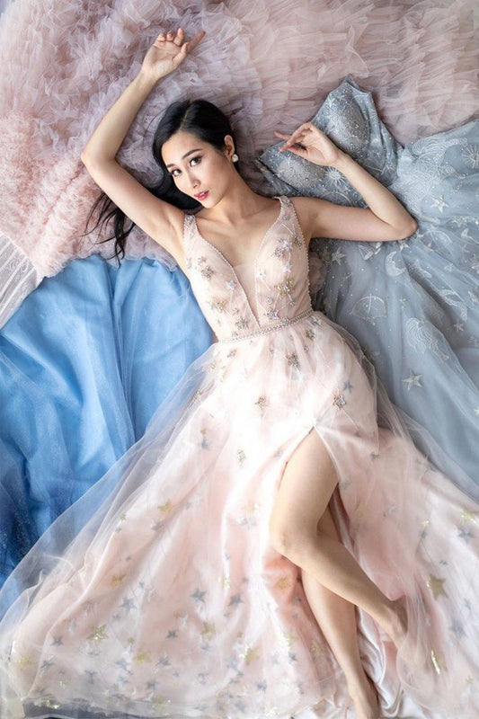 Starry, beaded V-neck tulle A-line wedding gown - al-gabrielle