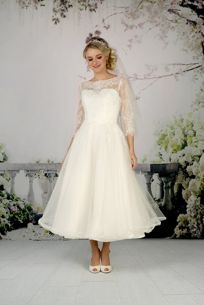 Cora. This pretty tea length bridal gown has a French and corded lace bodice with illusion neckline and 3/4 length sleeves. The tulle flowers on the bodice are embellished with sparkling crystal. The lace detail flows onto a full tea length tulle skirt, complete with a horsehair edge on the hem.